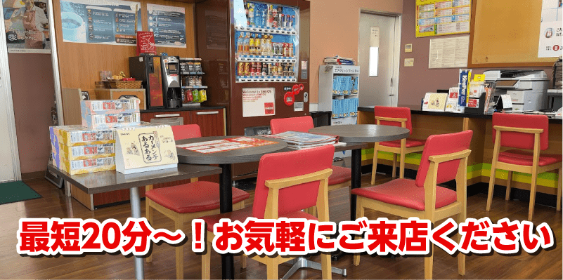 ご予約いただければあまりお待たせせずに作業にとりかかりますので、およそ20分程の待ち時間となります。お客様の混雑状況によっては多少前後することがございます。